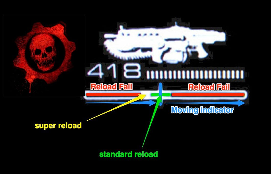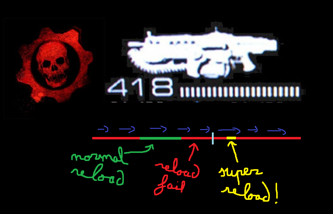 >>737620504put tiny slivers of yellow at the ends of green and you have to hit both for perfect reload. first gives extra damage and second speeds up the reload.