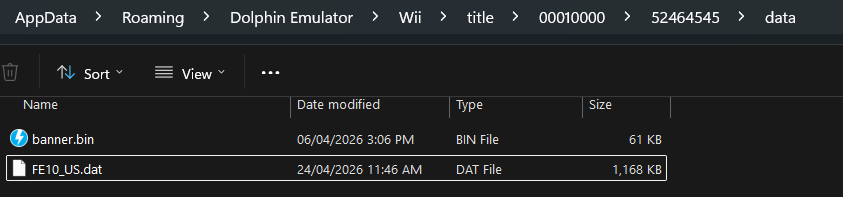 >>737622125here is the file, as well as the path for saves in Dolphin, with picrelhttps://files.catbox.moe/kjl57f.datalso, the game version I have is "Fire Emblem - Radiant Dawn (USA)", as an .rvzI think that's all the details I can give, but I can answer some questions if they ever come uppre-emptively answering this question :>Are you a retard?Yes.