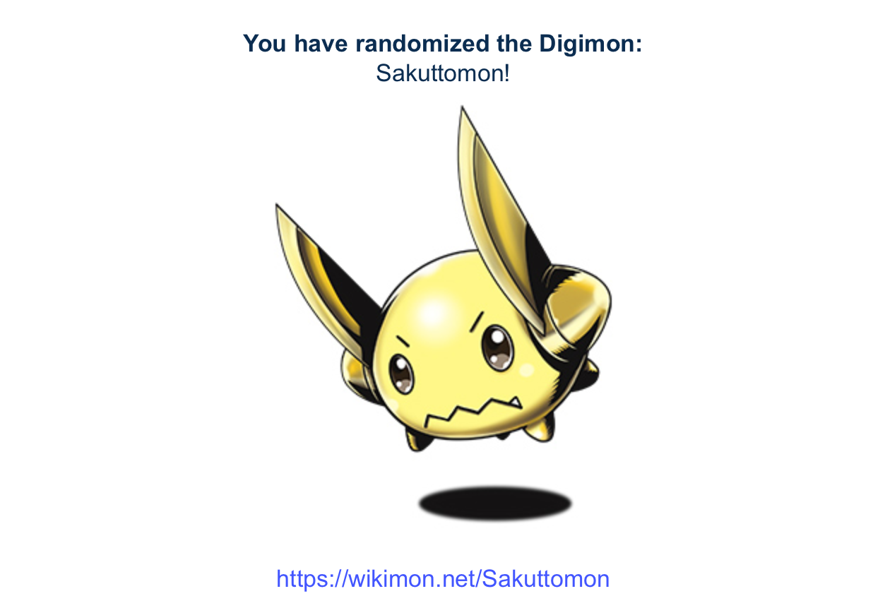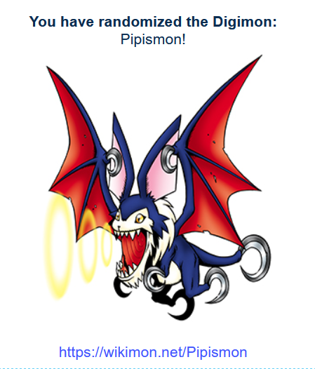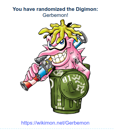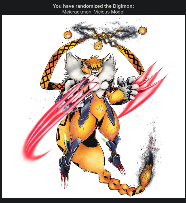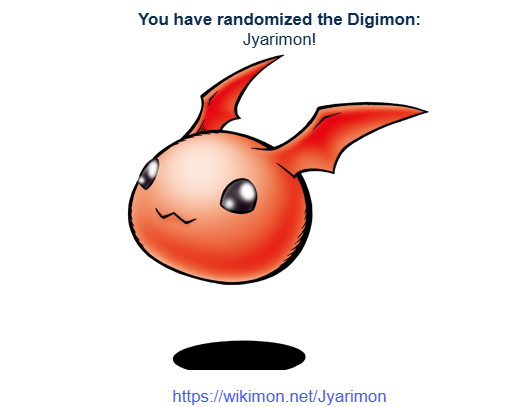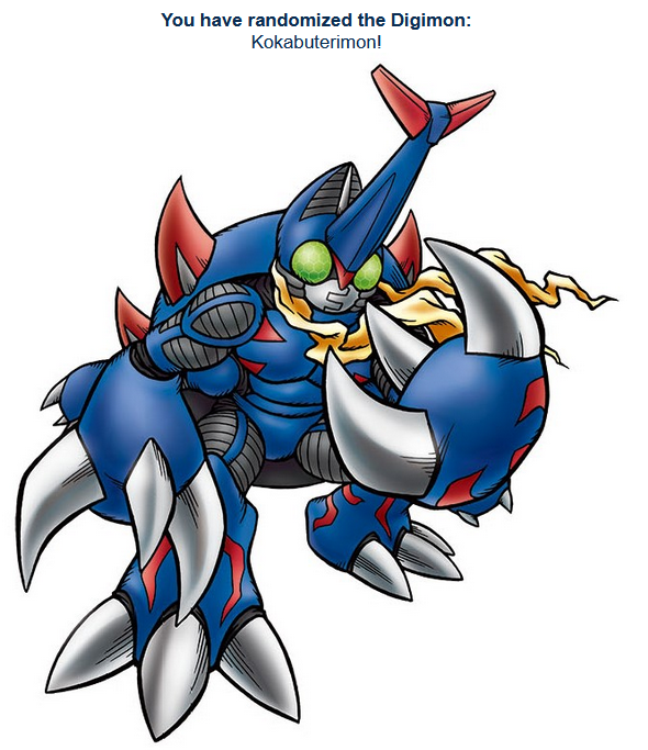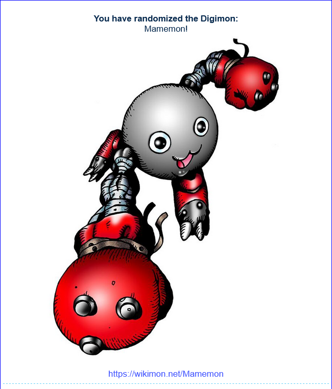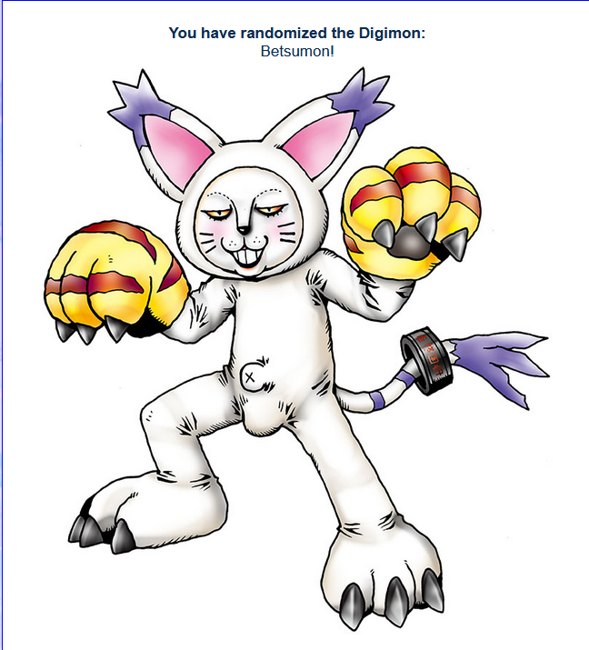 >>737625931Alright, enough fucking around with dumb quizzes. You click it, you get your partner. Simple as.https://perchance.org/random-digimon>pic relCould be worse.