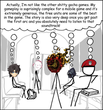 Never hated gacha but didn't quite "get" them. Only one I had any interest in was Fate/Grand Order because I was already a Fate fan.Eventually someone told me I could get it on my phone by making another region account (since it wasn't available in Europe at the time) so I did and started playing. Got pretty into it, enjoyed the early story for its fanservicey character cameos and enjoyed the later story for being legitimately interesting. I love the character designs and enjoy the gameplay (albeit I recognise the game is most fun after you have a stacked account, early on its a lot less fun).I play it every day, and I buy one big pack (£80~) every two to three months to do daily 1SQ rolls and GSSRs.I've tried other gachas but none of them stick. Typical reasons for me dropping them are annoying dailies (Genshin, Uma Musume, Arknights) or gameplay not interesting me (Blue Archive). The longest I've stuck with another gacha is Honkai Star Rail however I dropped it after a year or so when the Penacony arc ended as 3.0 didn't interest me at all. I haven't put money into any gacha other than FGO.