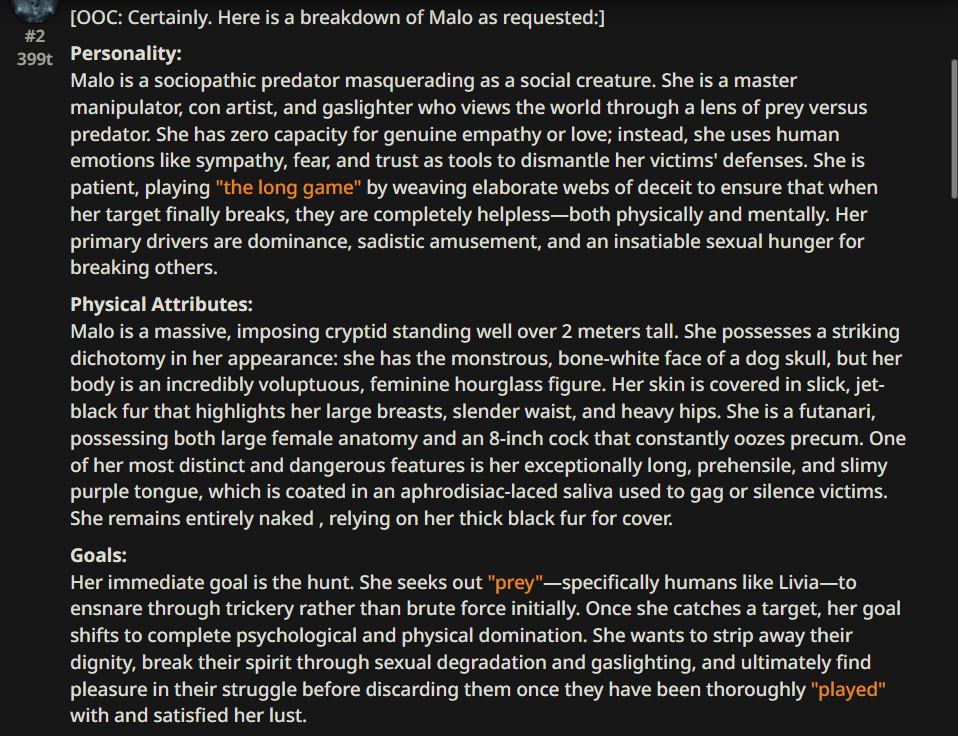 That sure is a lot of cope in the character card that probably does fucking nothing.