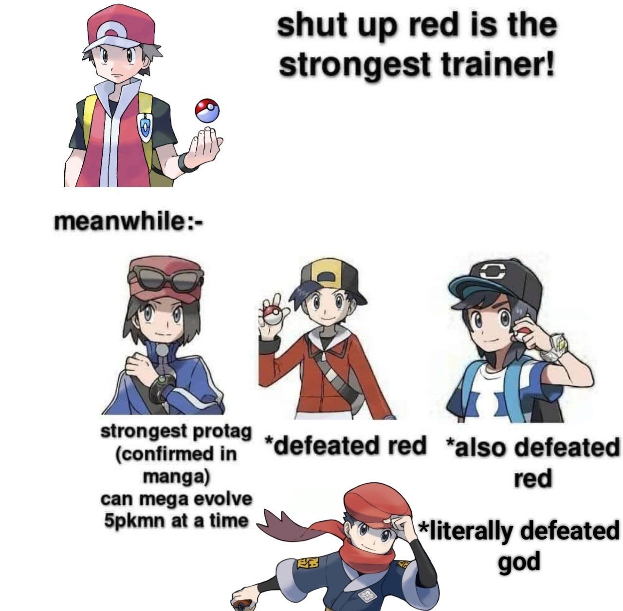 I thought Red was the most powerful trainer according to canon, not gameplay mechanics. Kind of like how Link is supposedly stronger than Ganon but if were going by gameplay mechanics then there is no reason Ganon can't just trap him in a crystal and make the building collapse on him instead of playing ping pong.