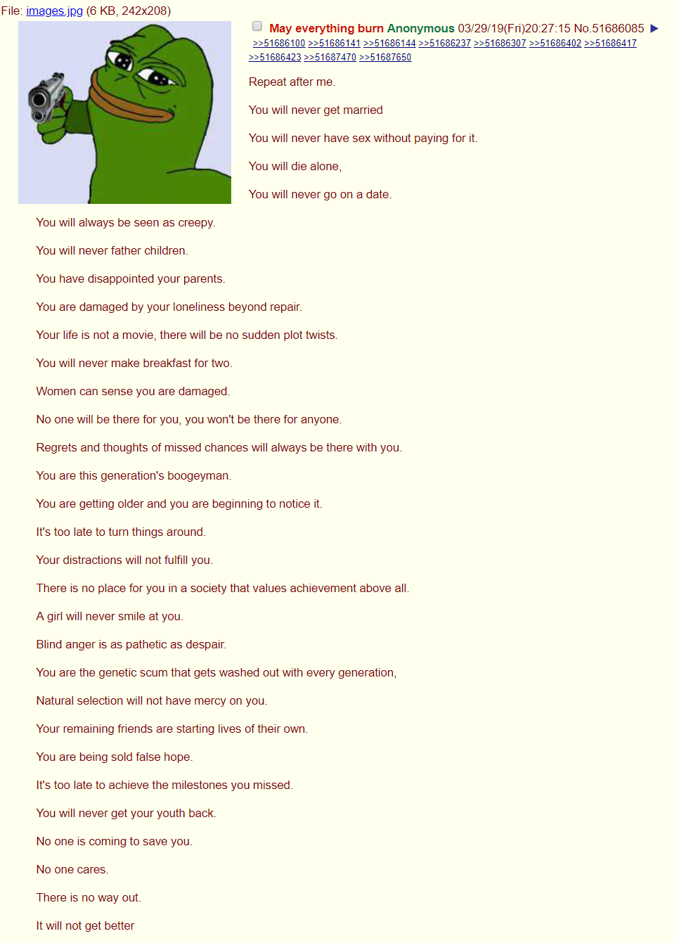 >>737637901It's not over for you, not yet. I didn't get laid for the first time until 36 and if i can have sex as a 6'8 fat ugly bastard with an only average dick I know you can too, anon