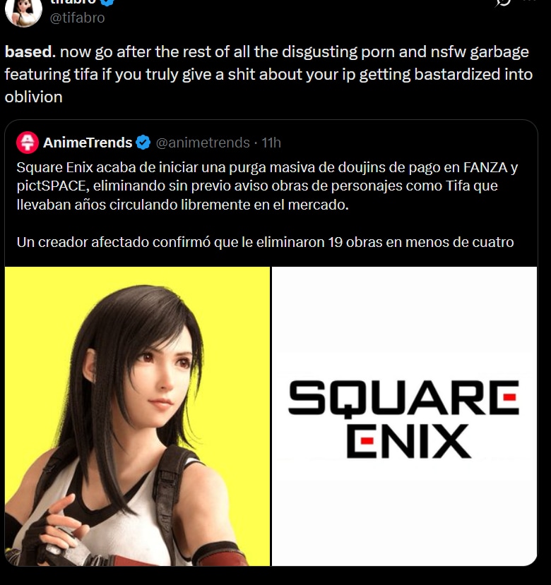 >>737637672>now that everyone can generate infinite tifa porn, we need to crack down on decade old dojinsSquare is run by retards and I can't believe they still aren't bankrupt