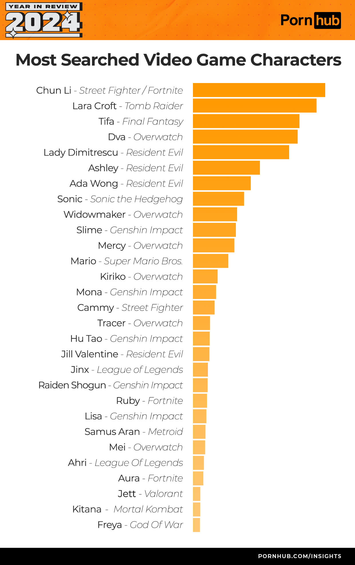 >>737651218>chun-li that highit doesn't feel like she's that popular, considering how little 3d porn she getsi'm very surprised d.va, 2b and most of others below her aren't higher than her