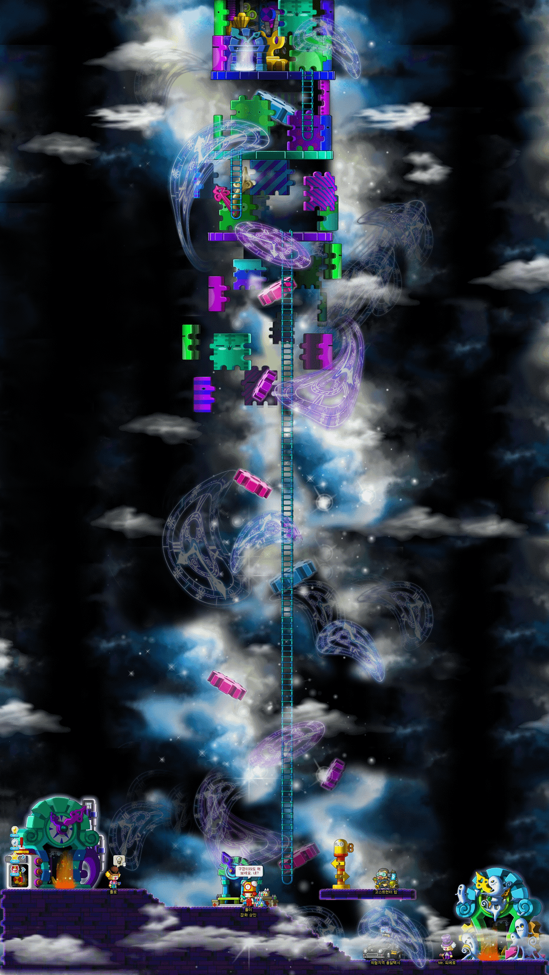 On one side of the bottom, you have the spirit vikings. Out of everything in Ludibrium these guys are giant adult-like figures in pirate ships. They haven't outgrown their childish side, and while it looks all cutesy with Maplestorys artstyle you will notice that they are actually quite dead, their desire to remain in childhood forever is eating away at their soul. You'll also notice that there are a few enemies that are bound to a clock, time. Regardless of their wishes, it will always move forward, they're slaves to it unable to move forward. Interestingly, at the very-very bottom you have a giant enemy called the "Gatekeeper" that protects the heart of Ludibrium. While it may seem cutesy due to the way Maplestory seems, I think it's quite clear that Ludibrium reflects the beauty of nostalgia, as well as the ugliness of stagnation.