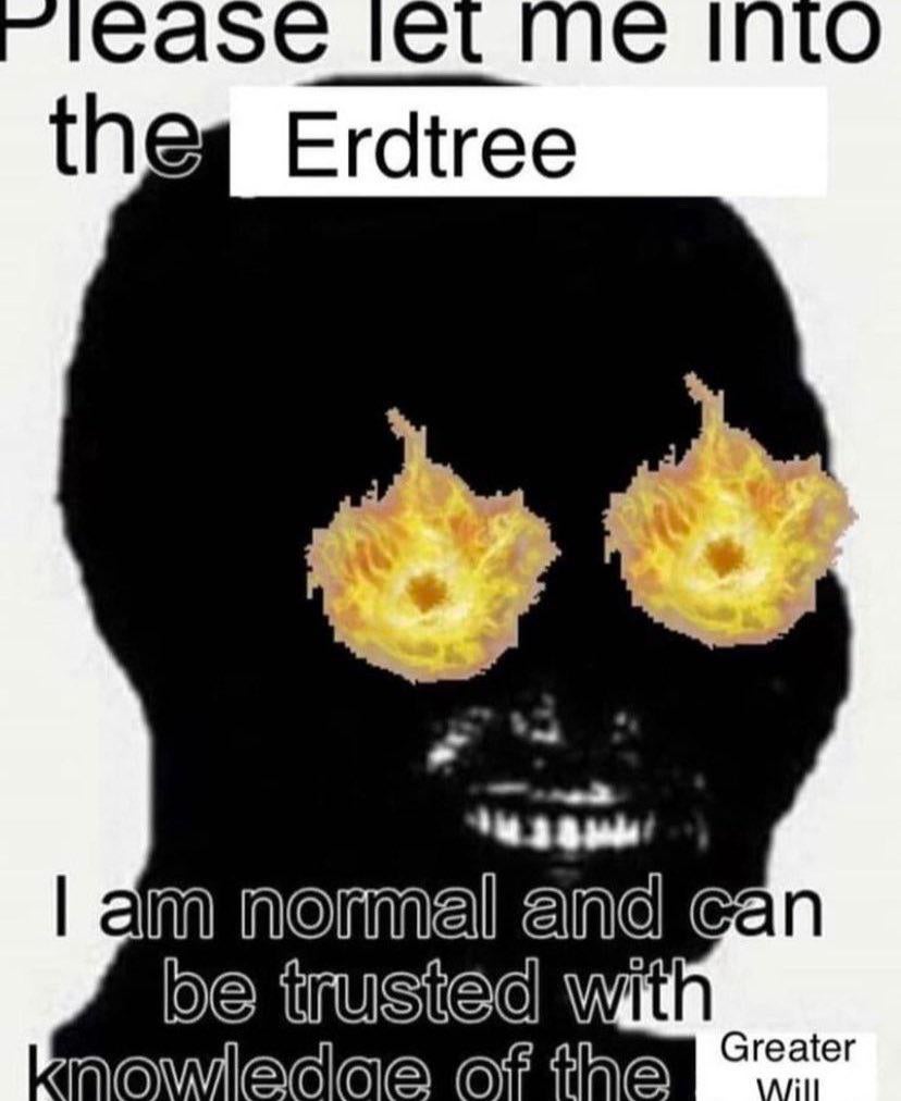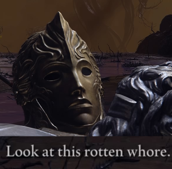 Elden Ring is the literal definition of woman moment and first world problemsEVERY character responsible for the world being currently a repulsive, rotting abomination is a literal immortal demigod/god whose entire lives were easy mode as soon as they were both, usually blessed with both beauty and powerExcept they thought they could do better than a pretty decent world already, and so decided to literally make millions suffer in constant agony because... there's a (small) chance whatever comes of this might be (slightly) better!!!!!!!!111!!!