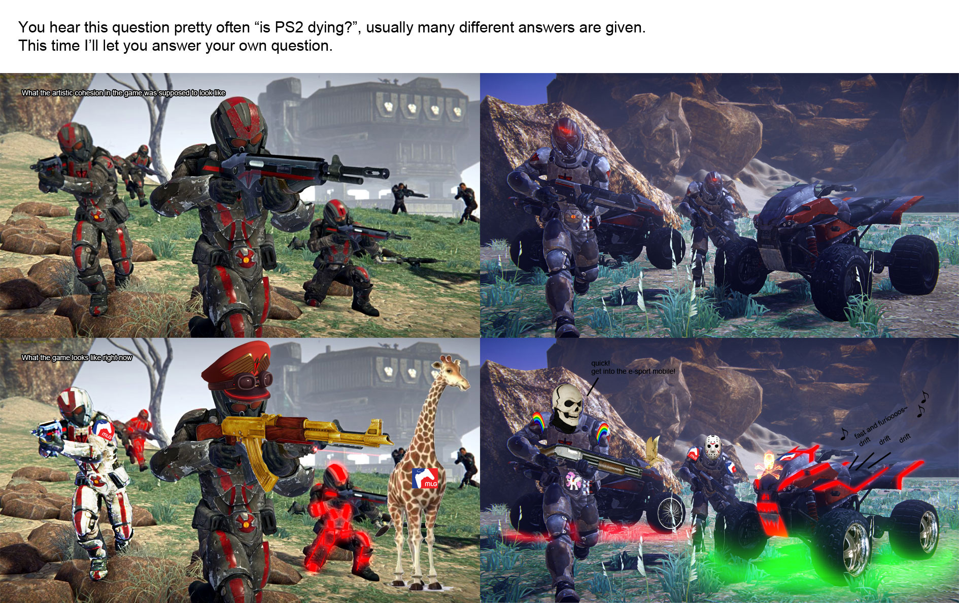 >all factions play the samethis is the most boring shit imaginable, other than the idea of "big ass map in which you can spawn and capture it little by little as an fps game", everything else about the game has always been as unappealing to me as possible, the game is just trashit's badly designed, both in terms of game design and in terms of artistic design, it just feels like a low budget game and always felt that way, except it isn't, it's fucking sony funding that shit, yet someway somehow it turned into thisI wish someone would actually try to make a real game, I never got to try that c&c renegade mod/game tho, so maybe that would've been it, but I'd pay very good money to play a game such as this with actual asymmetric gameplay, think full on natural selection type game, with aliens focused on melee, humans being the basic bitch soldier with all the toys, and then idk, robots or another type of alien or something, idk idc, just anything but 'yeah so your gun is blue but it hits slower but deals more damage!! yeah, that's what the faction does XD'wasted potential