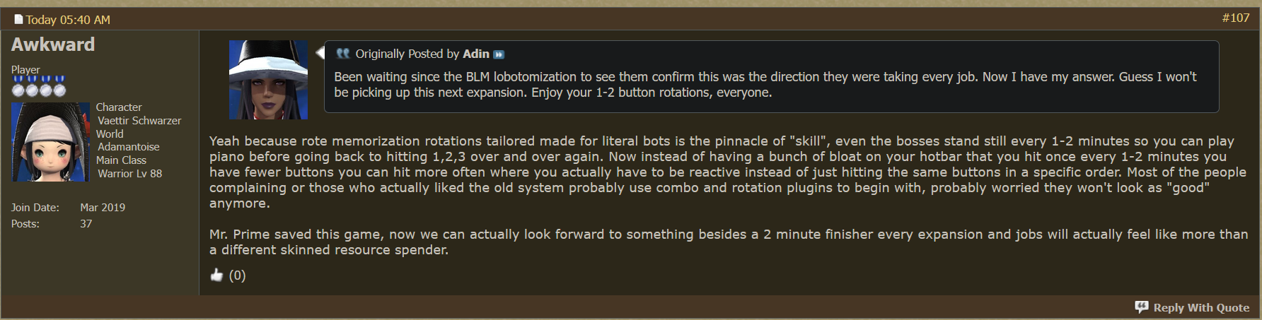 The funny part about the new class changes is for two reasons. Less buttons for the aging playerbase. More action-based combat, see the if you mitigate at the right time you get to deal more damage compared to just mitigating at the beginning to do more damage. Which satisfies the younger audience need of something frequently needing to happen.People are forgetting that dawntrail was the push towards trying to wrangle in the younger crowd, the new gameplay system is also trying to do that.