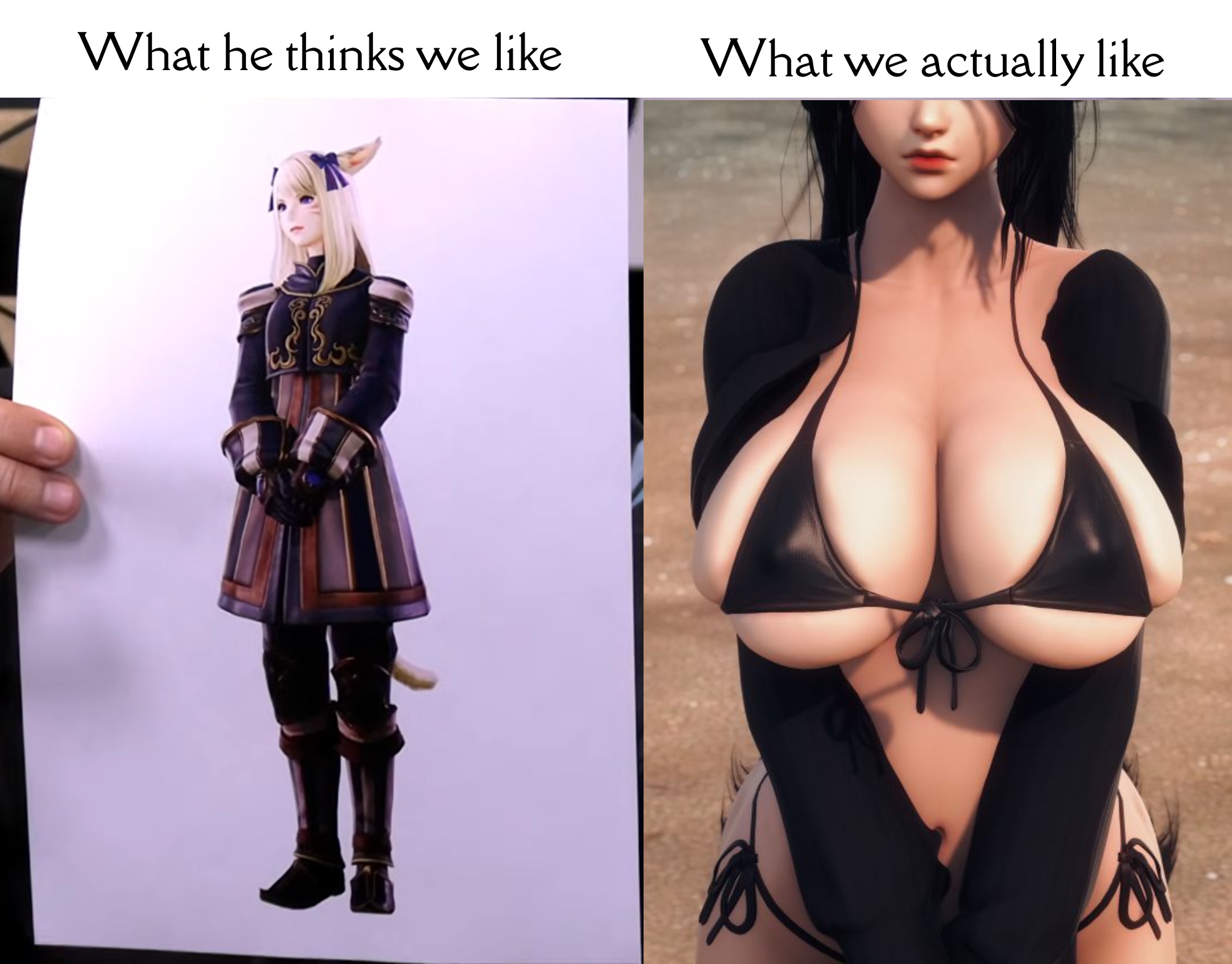 >>737660169it gets memed on a bit but the sheer technical debt the game is in makes the glam plate stuff be believable.The longer hair is actually fully understandable though. Think about it like this. If you do a swing up, your long hair should follow it. If you swing your sword down, your hair moves in a different way.Multiply that by the amount of genders, races AND jobs that we have and it becomes unteneable unless you introduce a whole new system to handle hair physics. In which case we're back to that whole technical debt thing.