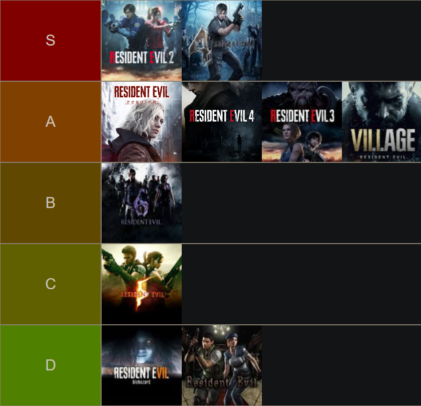 i finished playing a couple of resident evil games yesterday, i had never played any of them before, this is how much i enjoyed themyes i know i didn't play a bunch of them and yes i did not enjoy RE1i played them in this order, RE1, RE2 remake, RE3 remake, RE4 remake, RE5, RE6, RE4 OG, RE7, RE8, RE9