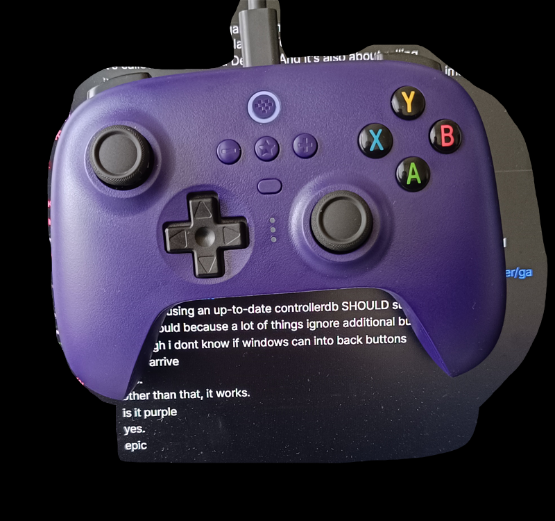 >>737681326I just checked and funnily enough I got my Ultimate 2 (also purple) literally exactly 2 years ago, on April 26, 2024. Pic related, I took it on that day when it arrived. I shopped it, because the picture was taken with my screen in the background. I was talking to a friend who recommended it to me.For half a year my RT/R2 has been broken. I checked and it seems it's a common problem, you can google it.And since then I've been waiting for the new Valve controller. Xbox One and Series both lasted a year before they started drifting. 8BitDo 1.5 years.I hope Valve's controller will last as long as my Dualshock 1 (10+ years of daily usage and it's still working even now 10+ years since I stopped using it) or at least X360 (5+ years).