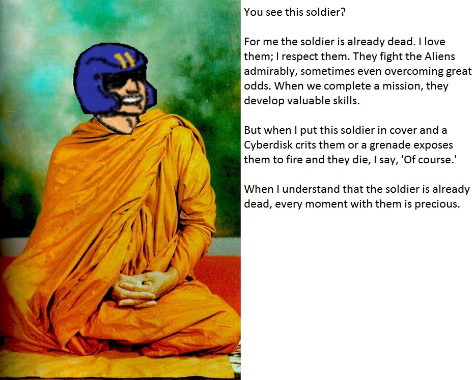 >>737681363>What am I in for?Having one guy mind controlled in your helicopter and killing 2 of your best soldiersOne soldiers panics and get killed outside by a sectoids camping near your landing siteYou manage to somehow win the level, it just cost you half your squad when you started and you return with three back home with PTSD and survivor's guilt because the injured vet grab grenade to his mouth and ran to the group of alien in a sacrifice.Havent found a game where I could find this sort of story and gameplay, maybe Xenonauts but that game is basically Xcom without the PSI stuff and imo they missed cool scenarios where the US/USSR can join the aliens to win the cold war.