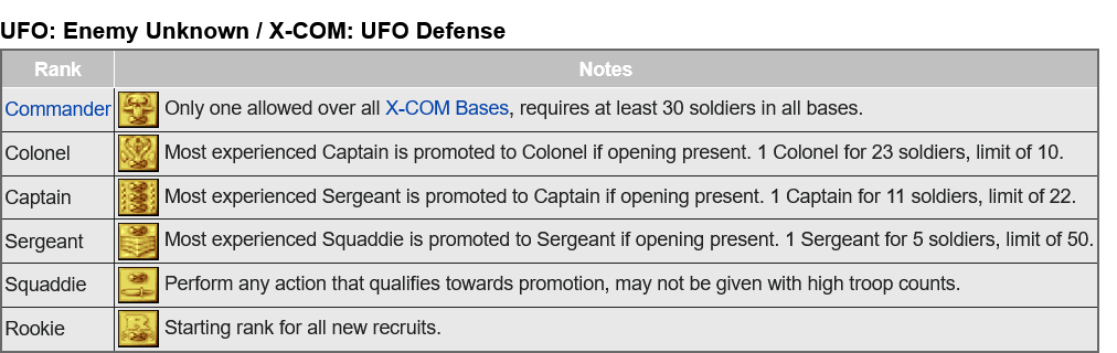 >>737681363Your highest rank is determined by total number of soldiers. If you try to keep a small group like you're playing NuCom you're literally never see anyone promoted above Sergeant.Higher ranked soldiers make you lower ranked soldiers lose less morale and lower the panic/berserk rate when shit goes south just by being on the map. Until the highest rank gets killed, which has the exact opposite effect. Keep them out of harm's way. And unarmed if you find out they've got shit tier Psi.