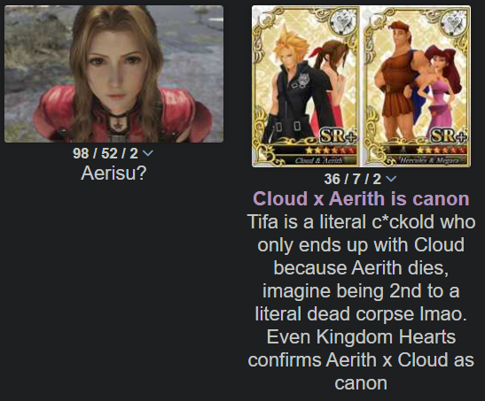 >>737692492Anon it's just rkun. He has been jelly of cloud's preference for Aerith for years now