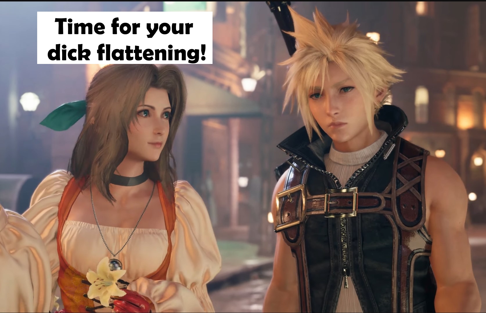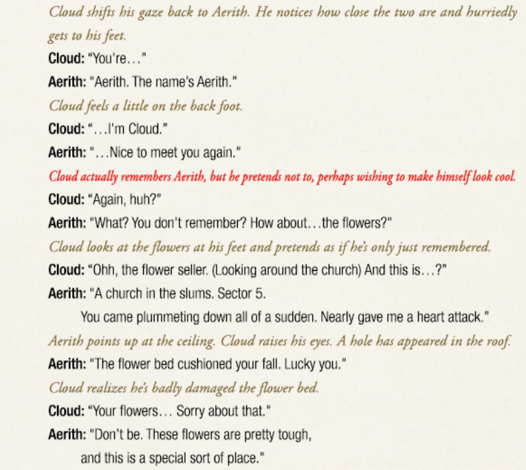 It hurts so much she remembers in remake and Cloud doesn't. She tells him to not fall in love with her when she's been in love with him since the OG.Just let me marry her already.