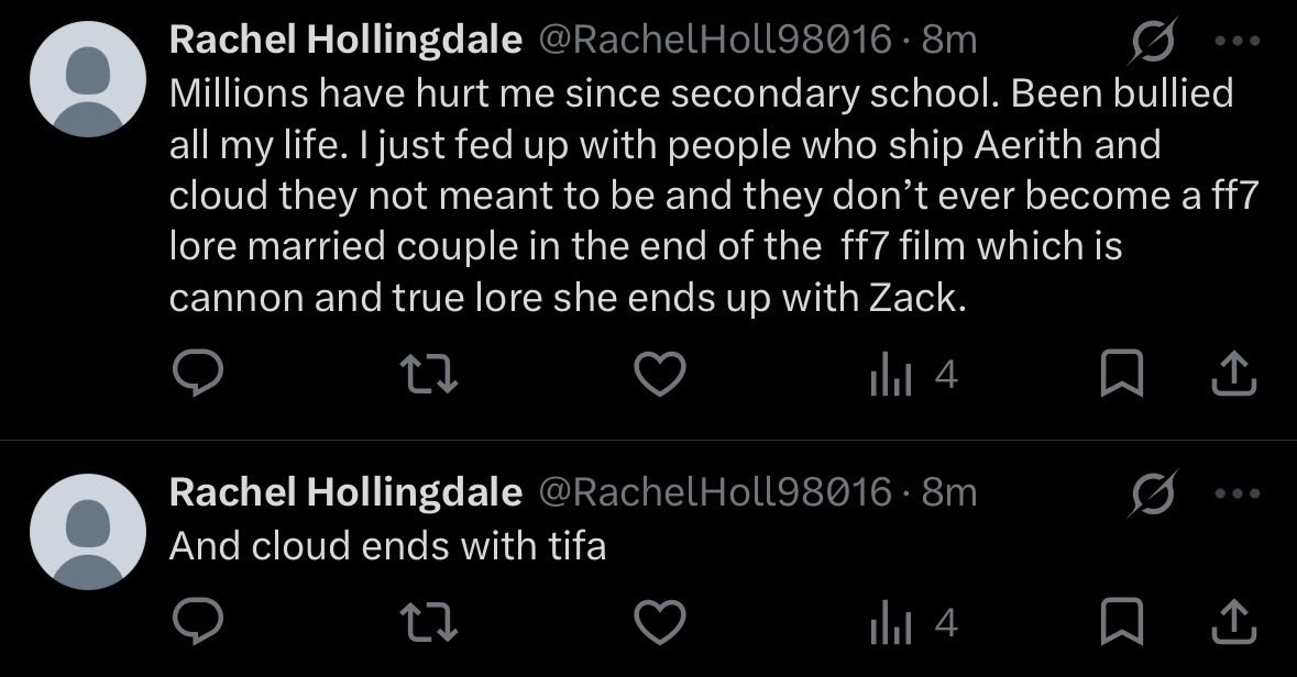 >>737691369>#1Entirety of Rebirth is about letting her go. You're delusional. Wait, are (You) Cloud?>#2She can't love Cloud for himself when the only Cloud she knows is a freakish amalgam of three different people brought on by severe trauma and experimentatiin. Only Tifa knows the real Cloud and loves him for it. Aerith only knows BrainDamage!Cloud who assimilated her boyfriend and Sephiroth.>#3Goddess of nothing, that would be Minerva. Cetra also got setup as cosmic assholes (Gi backstory) in Rebirth sooo have fun with that :)>the symbol of poverty and poor fertility is more popular than the oppositeAny more cope Aerithbro? Oh who am I kidding, you've got enough of it to last a lifetime.