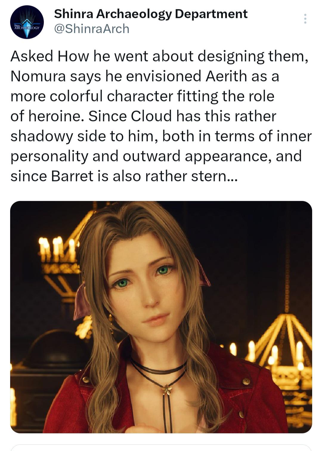 >>737741683>Aerith >a great choice for (describes Cloud)Well ok, then. Guess that's that.