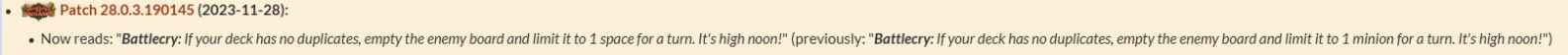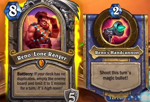 >>737699865>I think they even changed Reno’s line about it being a showdown as well.That line made no sense to begin with because it implies that you're in a one-on-one duel, except only your opponent was limited to one minion. The nerf that the card should've gotten is that it limits your own board to one slot as well.