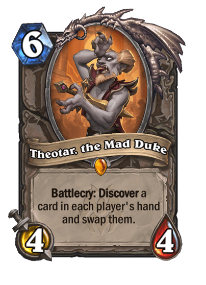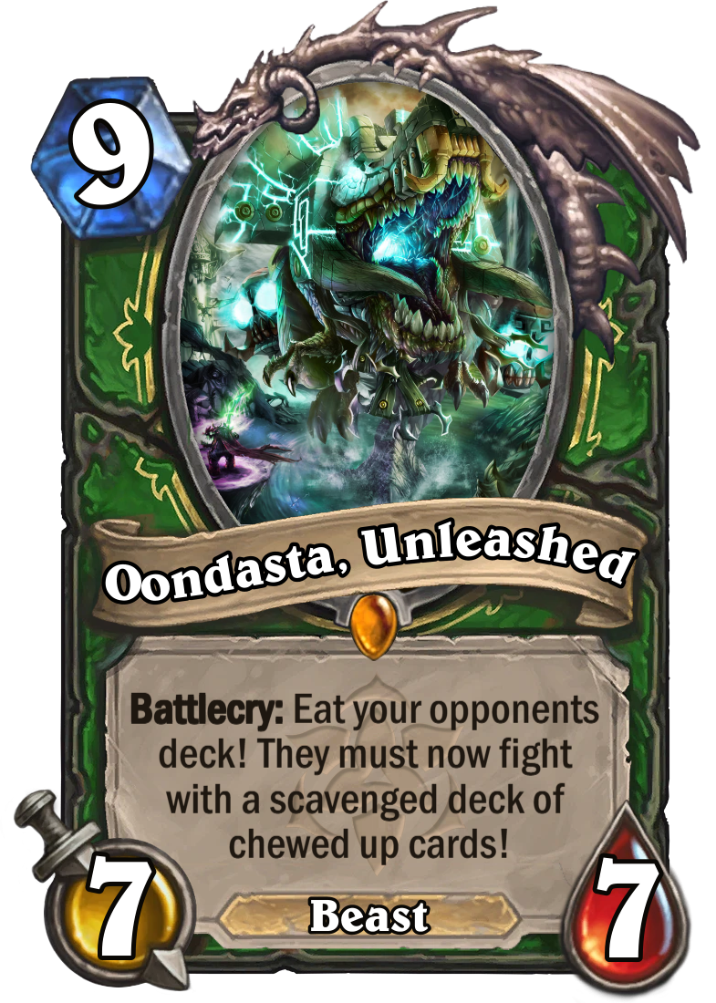 >>737691053just to explain why this card is so fucking retarded for people who don't understandthis card would remove the opponents entire board, not destroy them so deathrattles were not triggered, they just got poofed out of existanceTHEN it would limit the opponent to only have 1 slot on the board for their next turnAND it gave an upgraded hero power and healed youit basically meant wipe your opponents board and they can't play next turnfor fucking 8 manaabsurd card
