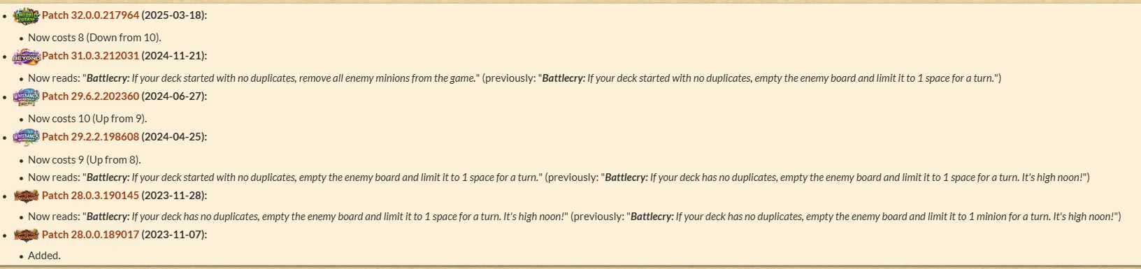 I watched a couple of Hearthstone youtube videos relatively recently and it looked like the powercreeping had gotten so severe that decks were explicitly just broken vs. broken. There was no possible way to deck your opponent because they seemed to always have infinite value of a million billion discovered cards and generated cards and random effects. All cards played seemed grotesquely overpowered.So it seems like they just abandoned the idea of a more balanced game and just went for sparkly lights and flashing colours no brain involved.