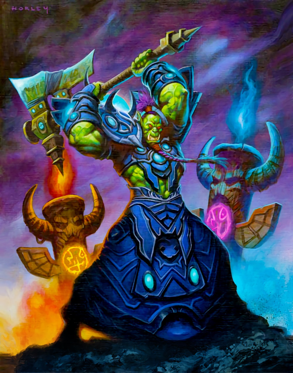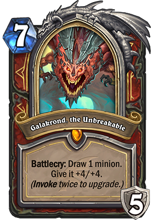 >>737690535Deathwing starts off with "Battlecry: Choose one Cataclysm", which are>Summon a 12/12 Dragon>Deal 4 damage to all enemy minions>Destroy the Highest HP enemy minion.>Shuffle 5 legendary Dragons into your deck, they all cost 1.Playing two Herald cards upgrades him to 2 choices, and playing 4 Herald cards means you activate all 4 (and basically win the game, there's usually no coming back from wiping their board and playing a 12/12)