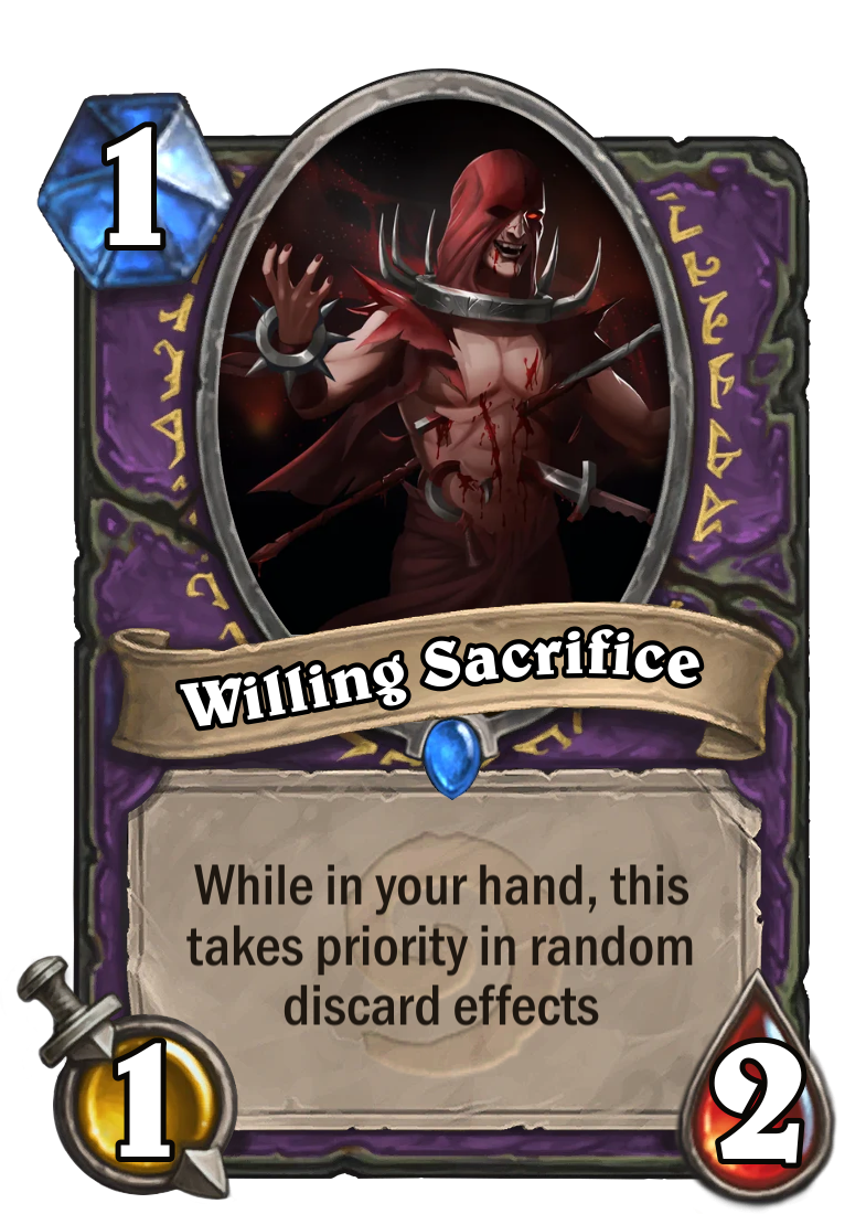 >>737721998>Cards that do something when they get discarded still need to overcome the hurdle of being lucky first, so they get to be the one that gets randomly discarded.Yes, but this is Cardstone. If you don't get lucky then you lose anyway, so better to bank on the semi-regular highroll.Now a good card would be a 1 mana 2/2 with the effect of "whenever you discard a card, discover a card from your hand to discard".