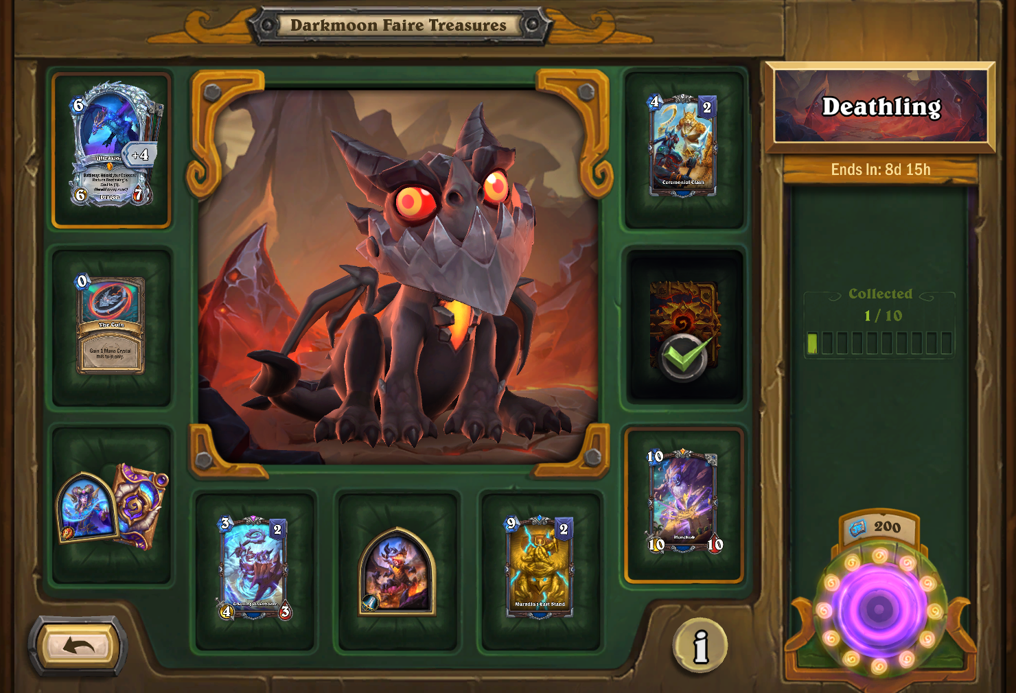 With the free pull I grabbed, meaning 0% chance of getting the Golden pack (Which is set to 50% originally.If I would spend $3, I would have...42% chance for a Signiture Art common card15% chance for a coin reskin13% chance for a Signiture Art rare card10% chance for Baby Wrathion Warrior skin9% chance for the Signiture Art Epic card4% chance for the Tarecgosa skin and card back3% chance for a Signiture Art Shaman Legendary no one runs2% chance for a Diamond card everyone uses0.1% chance for the Deathwing Cosmetic Pet.Price for each pull is1 - Free2 - $33 - $54 - $85 - $136 - $177 - $238 - $329 - $3810 - $63Basically it's a scam that pretends to be a game of chance for cards I cannot physically own. It's fucking retarded bullshit that whales propogate. I see the whales on Youtube excuse getting it because they are content creators and write that shit off. I fucking hate these people ruining video games
