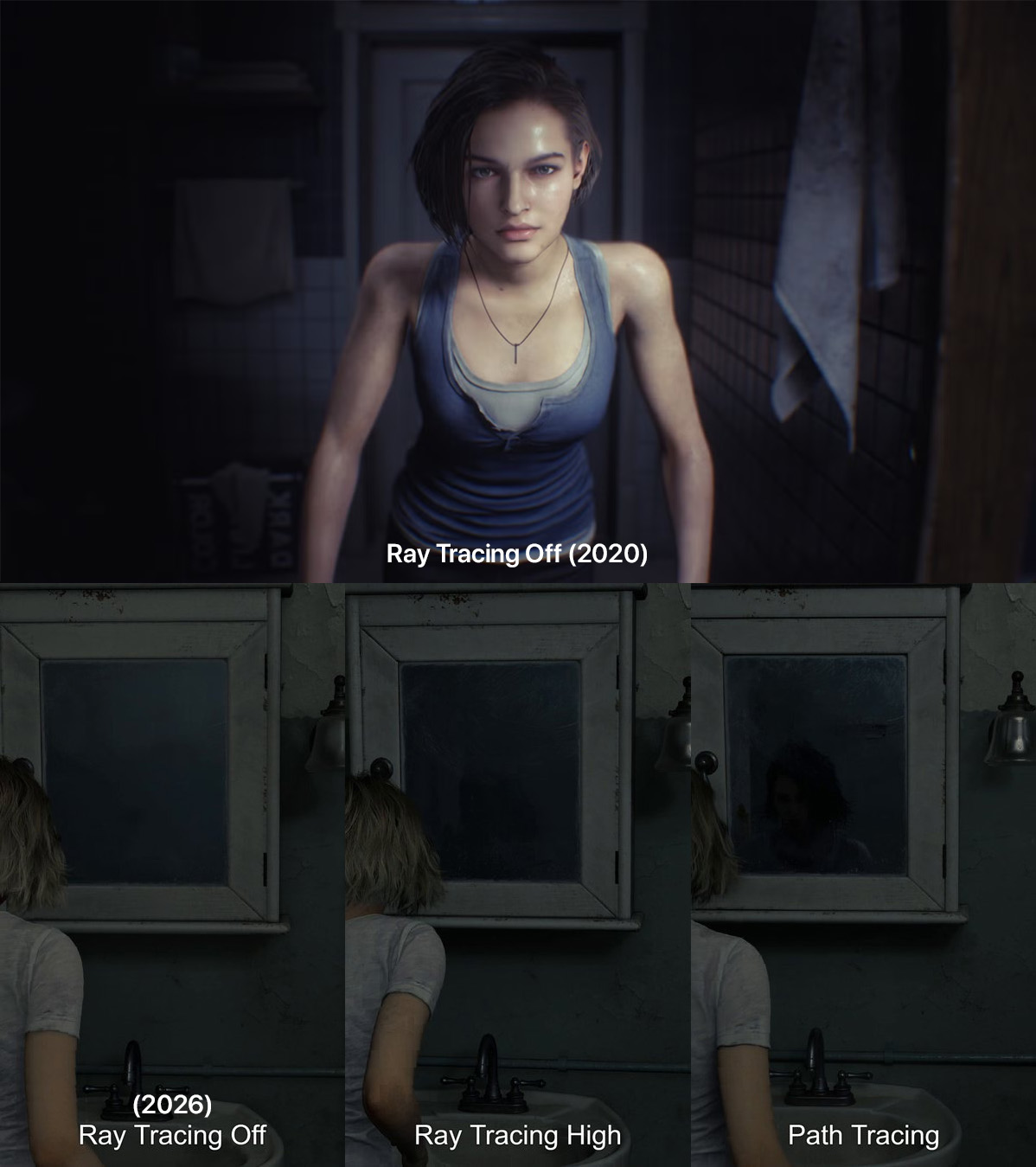 >>737692417Isn't the mirror in RE3r a scripted cutscene? I don't think it's an actual reflection. They added RT to RE2r and RE3r in an update years ago and it looks horrible