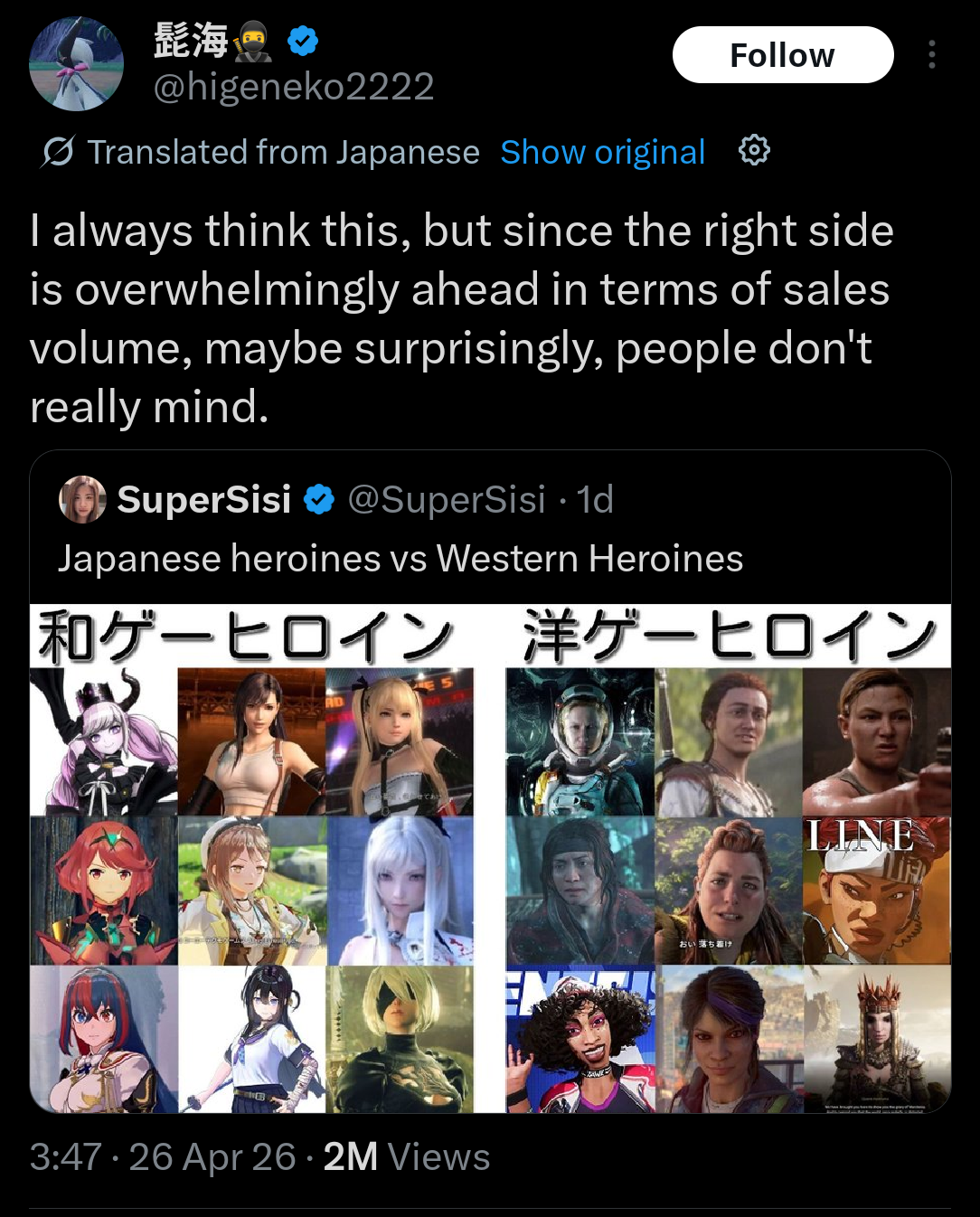 >>737692298>right side is overwhelmingly ahead in terms of salesThat's what happens when you bundle your games with consoles, as it happened with HDZ.Bundle the next DoA with the ps6 and watch those numbers soar. Also i'm pretty sure final fantasy remake alone sold more than all games on the right except Horizon. Fable hasn't released yet and is delayed, TloU2 sold because of the prequel only and was lambasted by fans for the writing, and the rest have zero presence except Apex legends which has designs like Loba, character whose ass is plastered all over 3d porn websites. The rest are literally who nobodies. The whole twit pic is cherry picked too because there are actual attractive western characters that aren't mentioned like Ciri, Lara Croft, FemShep, female characters from Overwatch, and in general female characters from before year 2014, when the feminist retardation infested entertainment.That pic should be renamed "Japanese heroines vs Post 2014 Western heroines".tl;dr remove feminism and the issue resolves itself, western heroines might even give eastern heroines a run for their money.