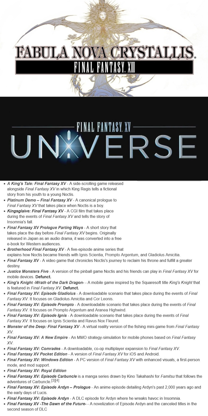 It really is a tragicomedy of game development. Tabata essentially took the "Fabula Nova Crystallis" concept, which was originally meant to be separate, complete games sharing a mythos, and mutated it into the Final Fantasy XV Universe, where a single narrative was shattered into a dozen pieces of required homework across different media.The way Square Enix tried to patch the sinking ship of FFXV’s narrative with disconnected spin-offs is one of the most infamous examples of fragmented storytelling in gaming history. To get the actual, complete Day-1 story of Final Fantasy XV, a player had to consume:Kingslave. So instead of letting you play through the devastating invasion of your own kingdom, which was the original plan for Versus XIII, they carved it out and turned it into a CGI movie. You start the game on a road trip, completely disconnected from the political tension and the fall of Insomnia, because all the dramatic heavy lifting was outsourced to an external film.And if you wanted to know why Noctis, Prompto, Ignis, and Gladiolus actually cared about each other, you had to go watch a five-episode anime series on YouTube (Brotherhood). Without it, you are just dropped into a car with three guys who seem like they are just there to nag you about your posture and driving.This is where the attempts to "improve" the game became painfully obvious during a playthrough. The developers actively created gaping narrative holes just to sell the patches later:Episode Gladiolus: Gladio randomly gets angry, leaves the party for a while, and comes back with a new scar.Episode Ignis: The most egregious one. A massive, world-altering battle happens off-screen in Altissia, and Ignis returns permanently blinded. If you only played the base game, you had absolutely no idea how it happened or what he sacrificed.Episode Prompto: He gets knocked off a train, disappears, and you find out later he had an entire metal-gear-style espionage adventure in the snow.