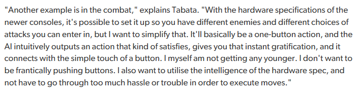 >>737717871We have no clue if the (kino) aesthetics and themes he was evoking on the trailers would've manifested on a good storytelling or setting.But there's a reason to believe that at least it would've been fun to play. And it's as simple as: the game was being developed by the Tokyo Team (or former "Square Product Development Division 1"). The team was behind every mainline Final Fantasy game from 7 onwards, and on the action rpg department they were the team behind The World Ends with You 1, Kingdom Hearts 1 and 2 (the latter especially having a tight fun replayable combat system that still holds up to this day). The last footage they publicly showed already showed promise. For the record, Divison 1 was completely butched in 2013 because of internal reestructuring and its members were split across various units so the team would never work together on a single project ever again.Meanwhile, the second Tabata the hack took control of the project he took a shit on the gameplay part and made it a game where "you hold a button and something awesome happens!" (interview from 2014)Thanks, Tabata, you truly saved gaming.