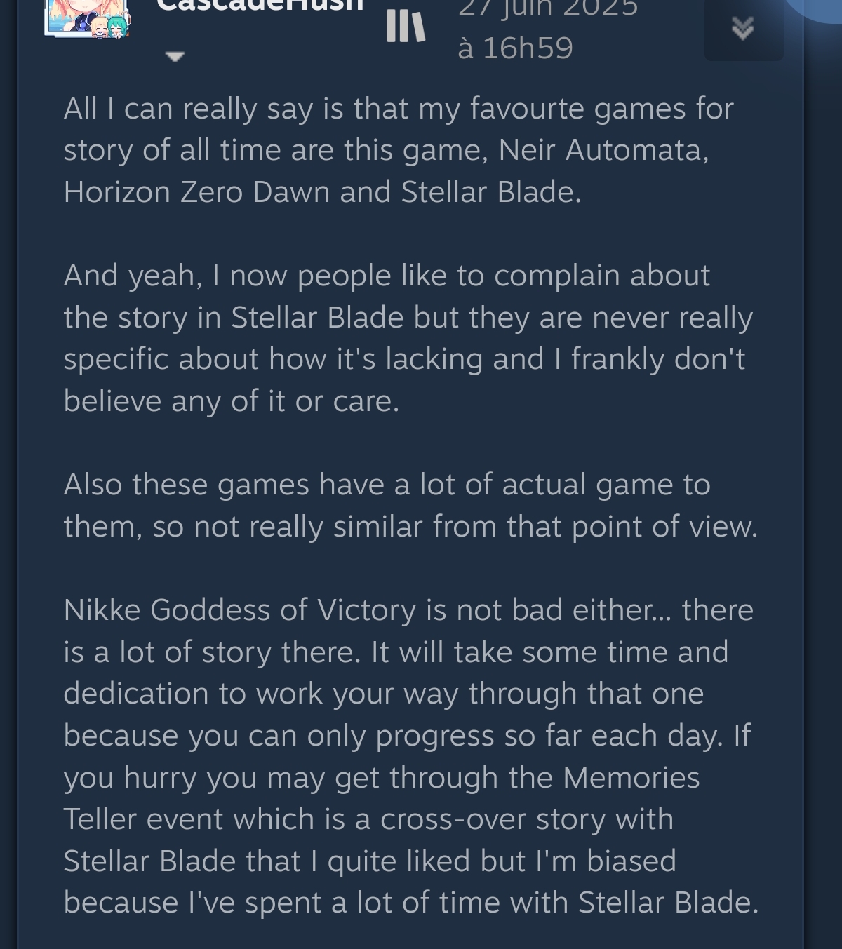 European from the most powerful European country here.Thanks to Steam and their forums, I discovered that people had very different opinions depending on the region.This individual is praising the storyline of the Korean gacha game Nikke. Yes, you read that right.
