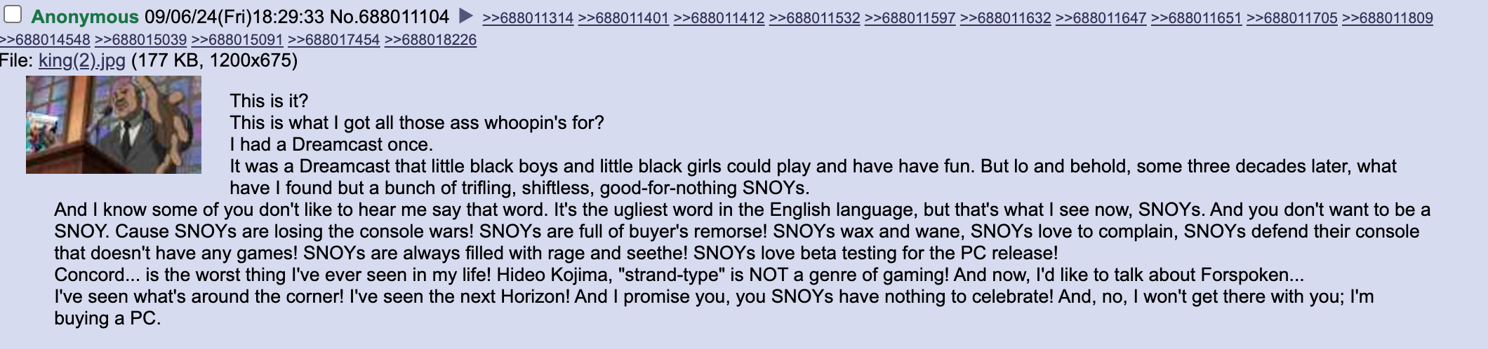 >>737731142By not derailing a thread about specifically shitting on Snoy by deflecting to all consoles while falseflagging as a PCvegan?Do you think I was born yesterday?