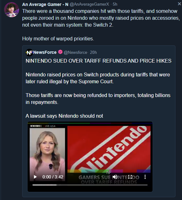 I feel like Americans are willfully retarded about how tariffs work, Nintendo still had to pay tariffs on every Switch 2 brought into the country even if they didn't raise the consumer price of it