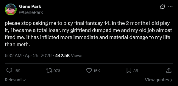 >>737723473>ENDWALKER>literally posting a 5 year old webmi quit this shit in endwalker but how fucking pathetic do you have to be to use this to shitpost, i know it's ironic but literally fucking go outside for 10 minutes you sad fuck
