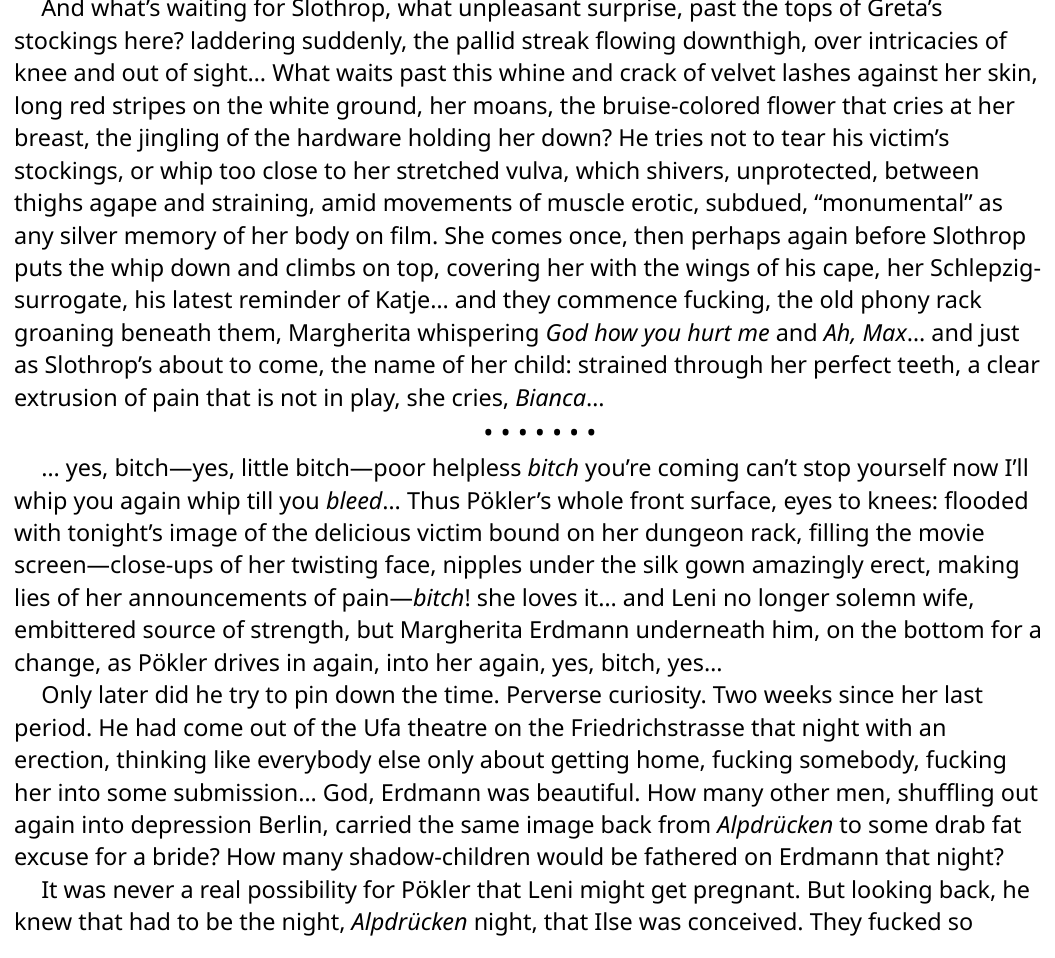 >>737741050Such a slender child: her throat swallowing, strummed to a moan as he grabs her hair, twists it... she has him all figured out. Knows exactly when to take her mouth away and stand up, high-heeled Parisian slippers planted to either side of him, swaying, hair softly waving forward to frame her face, repeated by the corset darkly framing her pubic mound and belly. Raising bare arms, little Bianca lifts her long hair, tosses her little head to let the mane shiver down her back, needle-tipped fingers drifting then down slowly, making him wait, down over the satin, all the shiny hooks and laces, to her thighs. Then her face, round with baby-fat, enormous night-shadowed eyes comes swooping in as she kneels, guides his penis into her and settles slow, excruciating till he fills her, stuffs her full...Now something, oh, kind of funny happens here. Not that Slothrop is really aware of it now, while it’s going on—but later on, it will occur to him that he was—this may sound odd, but he was somehow, actually, well, inside his own cock. If you can imagine such a thing. Yes, inside the metropolitan organ entirely, all other colonial tissue forgotten and left to fend for itself, his arms and legs it seems woven among vessels and ducts, his sperm roaring louder and louder, getting ready to erupt, somewhere below his feet... maroon and evening cuntlight reaches him in a single ray through the opening at the top, refracted through the clear juices flowing up around him. He is enclosed. Everything is about to come, come incredibly, and he’s helpless here in this exploding emprise... red flesh echoing... an extraordinary sense of waiting to rise...She posts, his pretty horsewoman, face to the overhead, quivering up and down, thightop muscles strung hard as cable, baby breasts working out the top of her garment...
