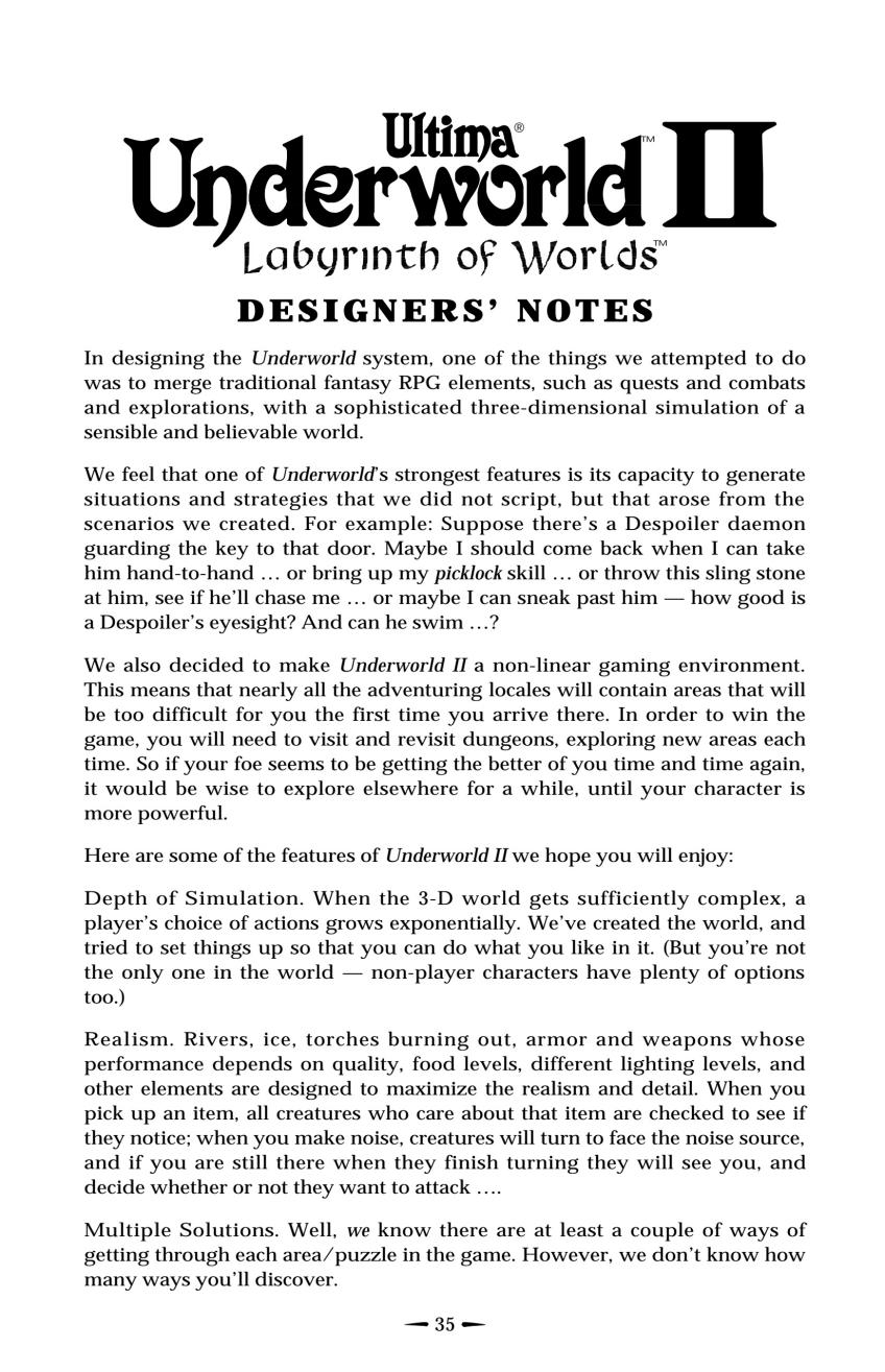 >>737743818Oh sure, but at Looking Glass for most of the 90s it was "immersive reality" rather than immersive simulation along with a few other variations of it going all the way back to Ultima Underworld. It's just lead to some confusion because a lot of people seem to think the term was coined by Warren Spector in his Deus Ex postmortem and it wasn't.Case in point here's the last page of the manual to Ultima Underworld 2, a game form 1993. I know they're not saying immersive sim yet but they're already talking about combining RPG mechanics with simulation elements and it's pretty bang on to what the definition is today.
