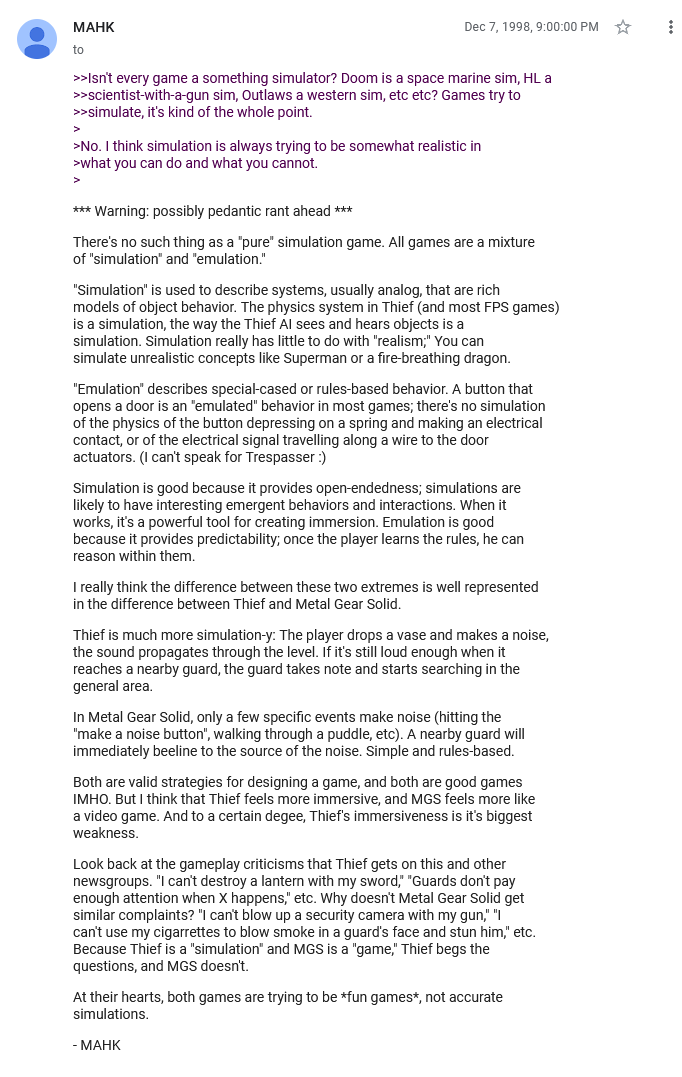 >>737744886No. Metal Gear Solid V there's... kinda a case for but as far as the rest of the series goes, no not really.And instead of listening to me I round a really good write-up here from Marc 'MAHK' LeBlanc one of Thief's lead designers circa 1998 - just days after Thief's release. He's the guy who programmed Thief's Object and Act/React systems (which is basically what we'd call an Entity Component System nowadays except this was about a decade before ECS became a thing in games.) So instead of listening to me here's someone who actually made the game talking about the difference between Thief and MGS.