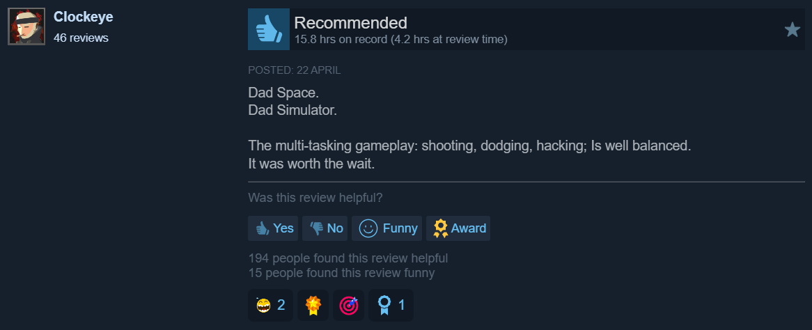 >Father son / daughter bonding.This is only being set up for the ending telegraphing it is going to be SAD.Only Metro did it right. Bioshock, Heavy Rain and Pragmata are trying too hard.I can vouch that the game is okay.