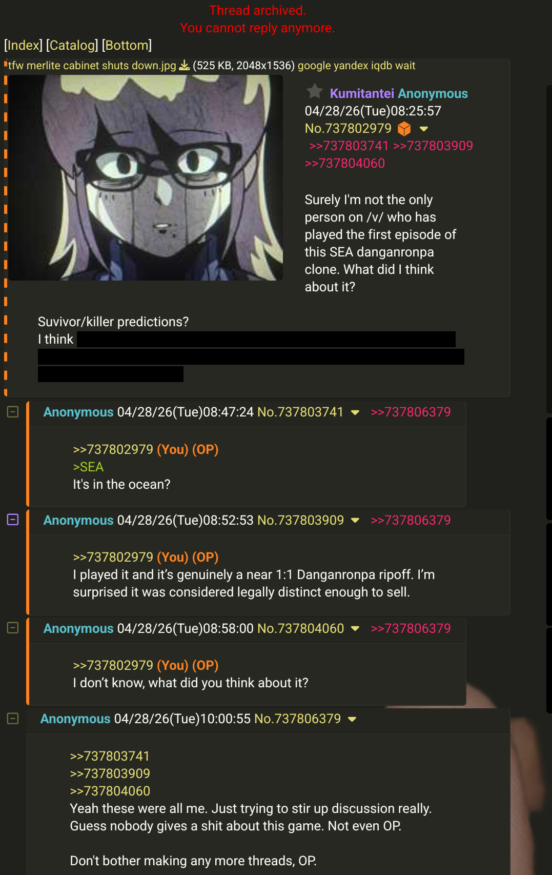 Made this thread mainly to apologize to the anon in pic rel lol. I made it during commute and was too busy to reply before it got archived, I was hoping it'd stay alive longer.So to answer your question regarding my thoughts about Kumitantei. Beware, it's kind of long and will obviously contain spoilers. But if I had to give a concise spoiler-free opinion, I enjoyed it. However I can only recommend episode 1 to people like me; massive fans of the genre who are ready to ignore small to middling gameplay hiccups, piratefags who can try the product for free and treat it like it was a fangame, and people who are ready to give non-japanese/korean developers a chance when it comes to "respecting the vibes" of Danganronpa. For both the good (wacky anime setting, otaku pandering) and the bad. Long review:I had a good time with it, even if the case was almost a literal retelling of DR1's first chapter. I thought it was a cool nod, but it's not the kind of thing I'd like to see in a product designed to be paid. would have been okay in a fangame like Another or Eden Garden. No issue with the VN parts other than not having the option to enjoy both the text blip sfx and short voice clips. But the minigames for the most part just sucked, especially the card battle deckbuilder thing. It doesn't feel satisfying to play and was something I already disliked when I played the demo some time ago, cuz it's too rng reliant. You can almost deplete the lifebar of the enemy, but at the last moment they barrage you with a combo because they happened to have 4 cards of the same color that beat yours, almost resetting your HP (common lifebar) and you are forced to go through the mini-game for another minute. Similar time-wasting problem with the space invaders thing meant to be this game's version of Hangman's Gambit. If you are unlucky, you can be wasting almost two minutes shooting aliens to cycle through the letters until the ones you need show up.