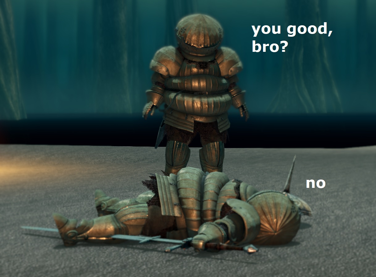 >>737828915You can play however you want but talking shit about the other people is crazy, I remember beating the Nameless King by myself in DaSIII back then and he kicked my ass because of my build, so I then told my friends "the secret boss will kick you ass if you're not prepared", then they just told me a few day later "He was easy as fuck, I just summoned two people who helped me, did it first try", and they just made fun of me because I found him challenging, I told them I did it by myself and they said "Well, multiplayer is part of the experience, so, yeah, he was easy".Fuck that shit, ridiculing someone else by their playstyle goes both ways, let shitters be shitter but also shitters should shut the fuck up.