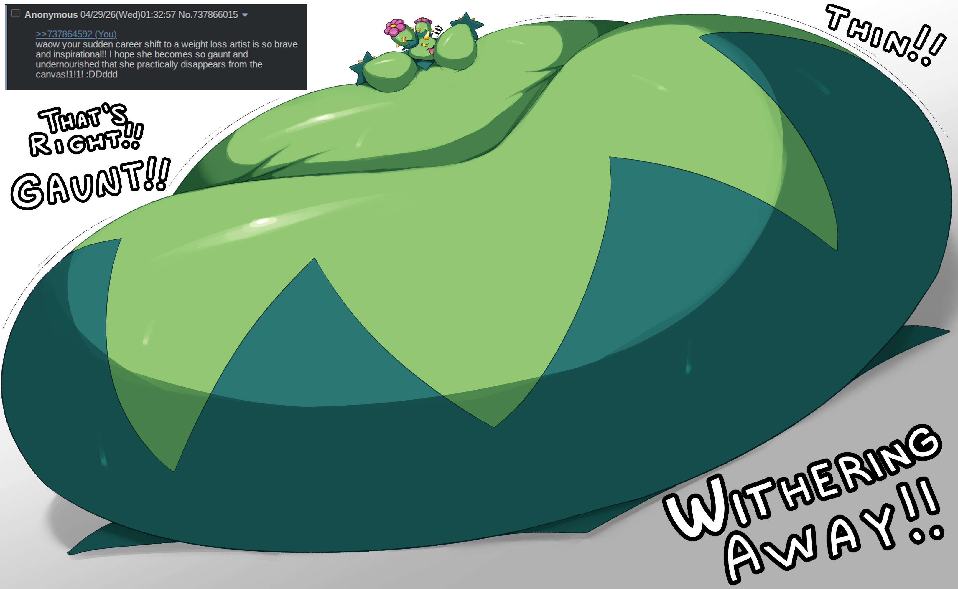 >>737856141maractus? more like, marFATc-...ma-FAT-ctus...maracFATus...she is hard to make a punny name for that doesn't look like word saladwhich is something she should eat. because she's fat.
