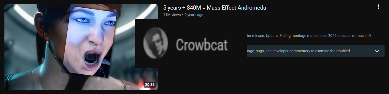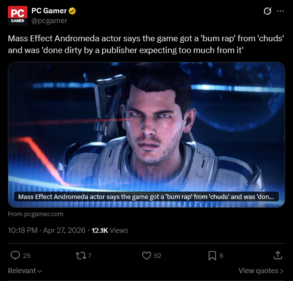I actually like andromeda a lot but it was mostly dunked on by just looking like dog fart and feeling like it was a discounted indie mass effect rather than mass effect 4. but sure chud nerd whatever i guess
