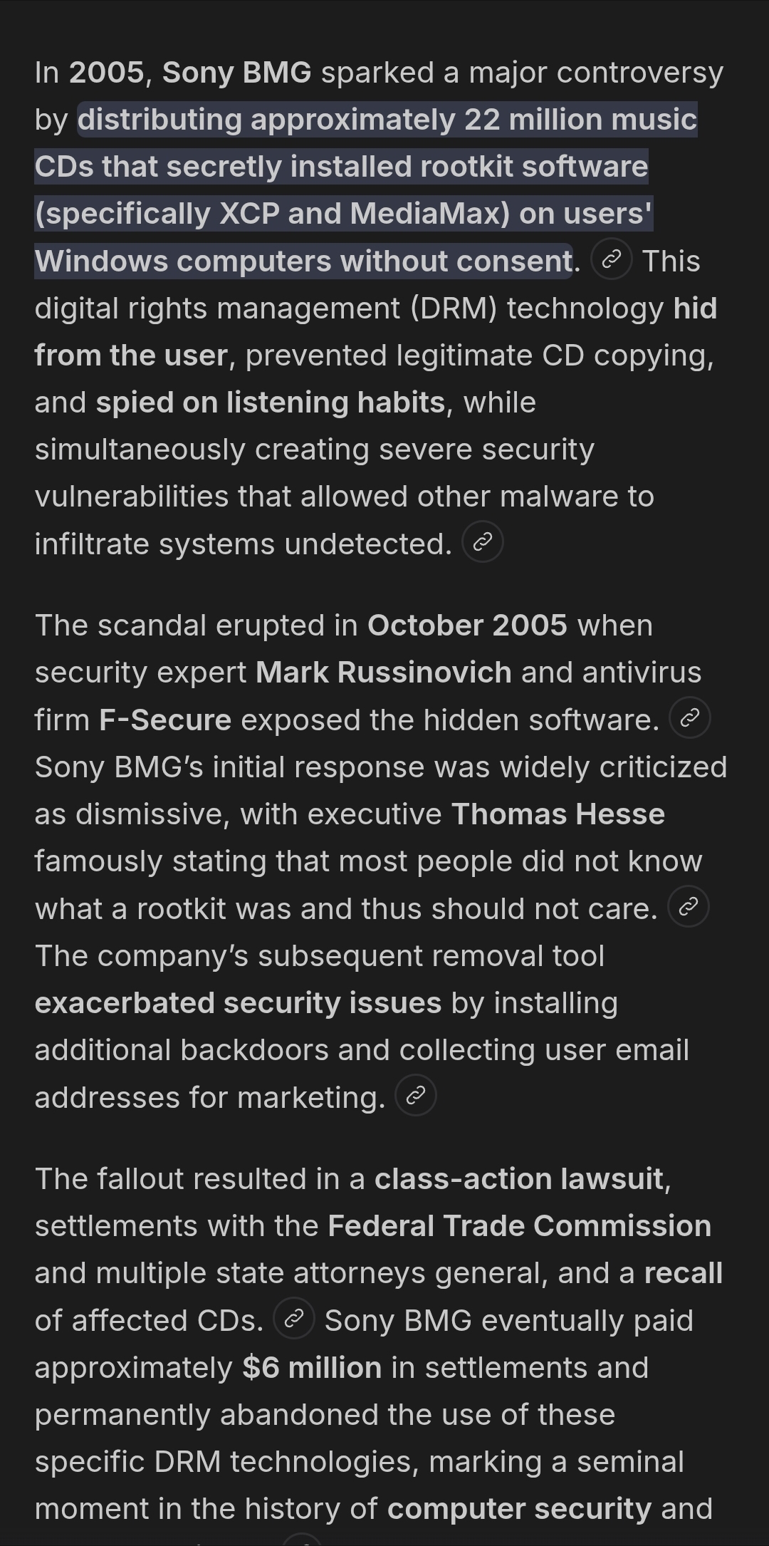 >>737852908Remember when Sony CDs put a rootkit on your computer if you put their Music CDs on your computer to listen to it it fucked your computer, than their "we soooo sowwy" move was to install a removal kit that was just a 2nd rootkit?