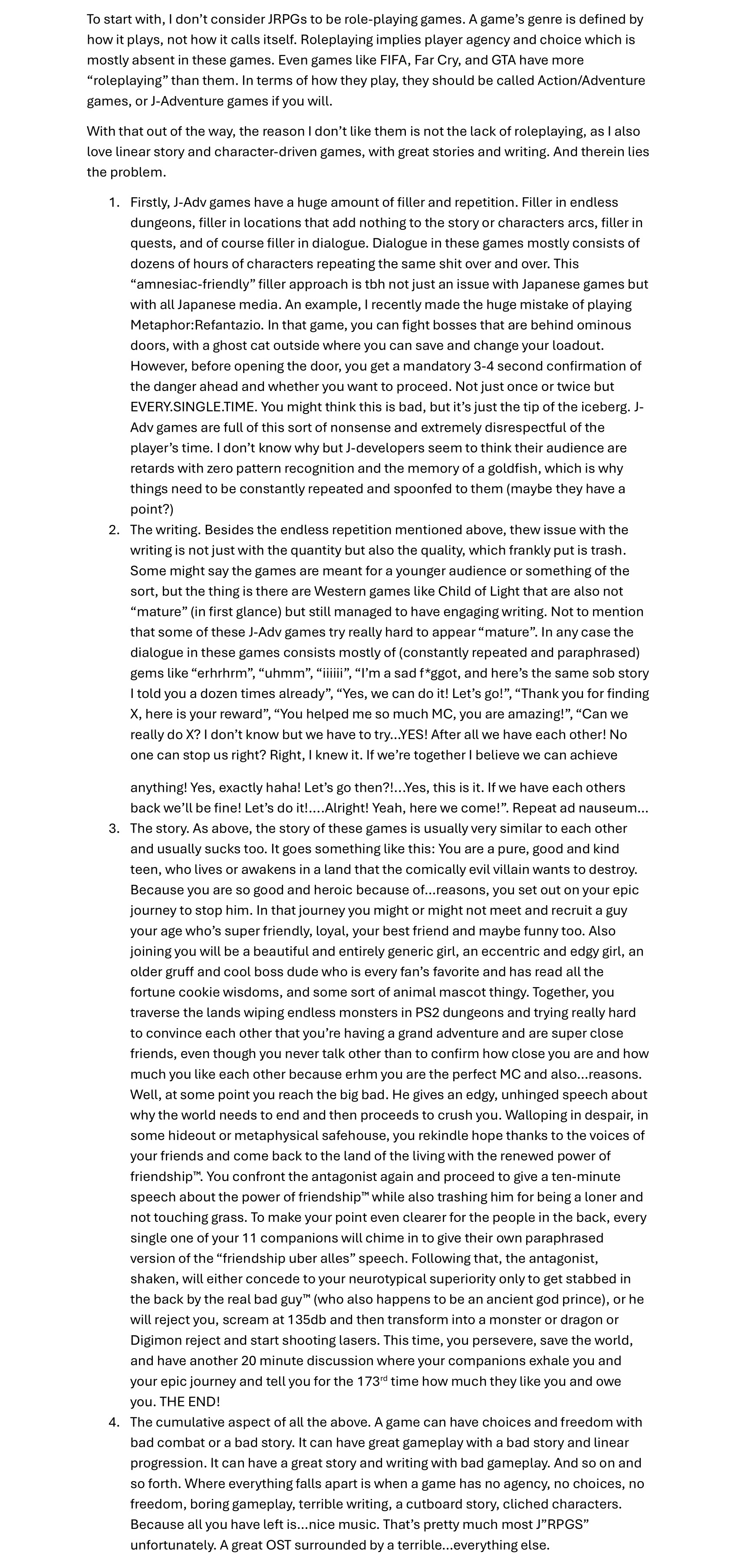 >>737850321I don't understand why this game was so heavily praised. Bland OST, insanely slow pacing, lackluster modern video game graphics, slow loading screens even on NVMe, very little strategy in combat, characters nobody remembers a year later, most boring dialogue ever, story was VERY generic, and in some ways made no sense since the MC asserted his correctness thought his sheer might exactly as Louis spoke of.The game also feels both burnt and still raw. There's an impressive amount of dialogue, with every NPC saying something new every time you advance the plot. There are also so many King's Qualities increase scenes that you'll max all of your stats before seeing them. On the other hand, all aspects of combat feel quickly slapped together. Status aliments are useless, shit ton of enemy and dungeon reuse, enemies reacting to your class isn't utilized beyond goblins, bosses stop having mechanics after the human at the cathedral. It feels like the were going to make a game with no combat but then realized that was fucking stupid.tl;dr more like MIDaphor, Monmusu Quest Paradox 3 is the best JRPG of the decade and nothing else comes close.