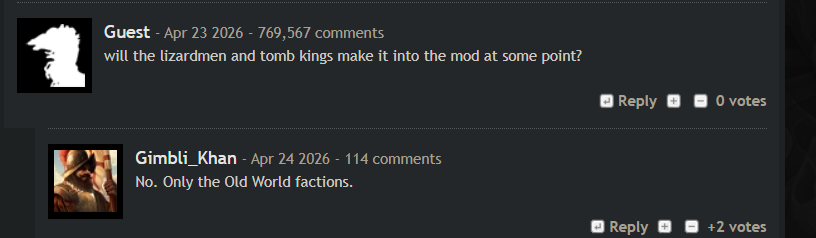 >>737855423https://docs.google.com/document/d/1CzK7T661DsFGVLyxDF5Gk3piXT9DbiaGW2BTv667fTA/edit?tab=t.7foqaxvefhv2>The planned playable races will include: Humans, Orcs, Goblins, Wood Elves, Dwarfs, Vampires, Skaven and Beastmen. This may change in the future, and will be updated in that event. looks like only Skaven and Beastmen aren't available yet, though Beastmen are an enemy rn so probably soon for them