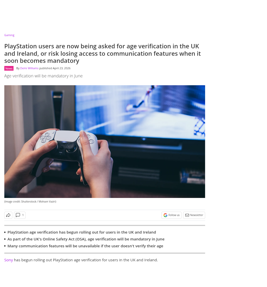 https://www.techradar.com/gaming/playstation-users-are-now-being-asked-for-age-verification-in-the-uk-and-ireland-or-risk-losing-access-to-communication-features-when-it-soon-becomes-mandatory>The age verification process, which is part of the UK's Online Safety Act (OSA), is currently optional, but will be mandatory starting June 2026, according to the FAQ.