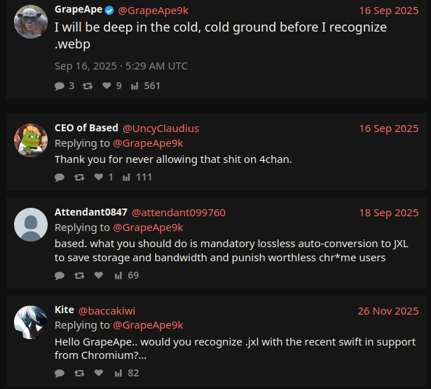 >>737962910>>737963504>>737963606>>737964270The head moderator of 4chan, rapeape has said he dislikes webp. we probably wont ever get it:https://x.com/GrapeApe9k/status/1967823045755830547