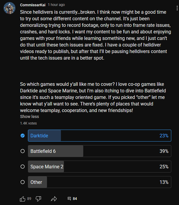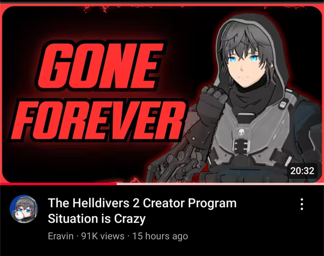 Why do you care? The only people that should are content creators depending on Arrowheads work to make money and Arrowhead themselves. Helldivers is a Sony IP and they don't give a shit about content creators, never have, never needed them, and never will because they make more than just video games.